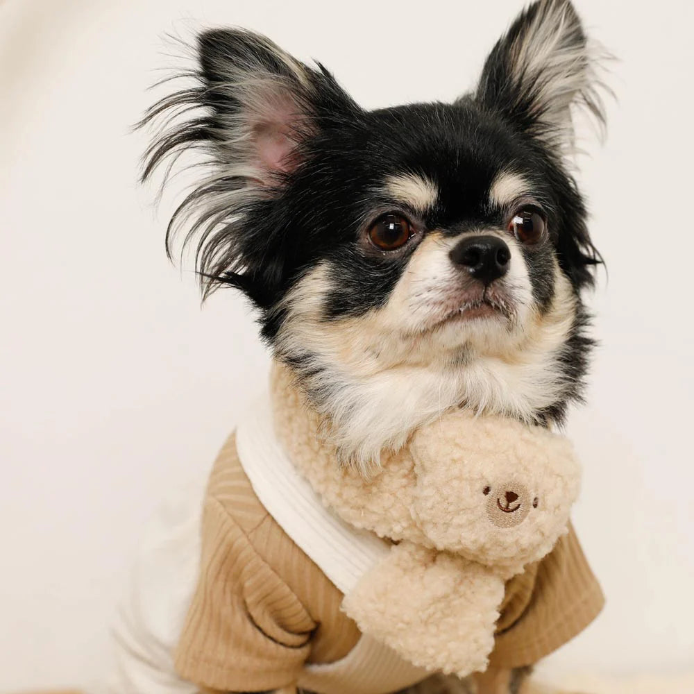 A fluffy bear muffler that covers the neck, ideal accessory for winter walks.