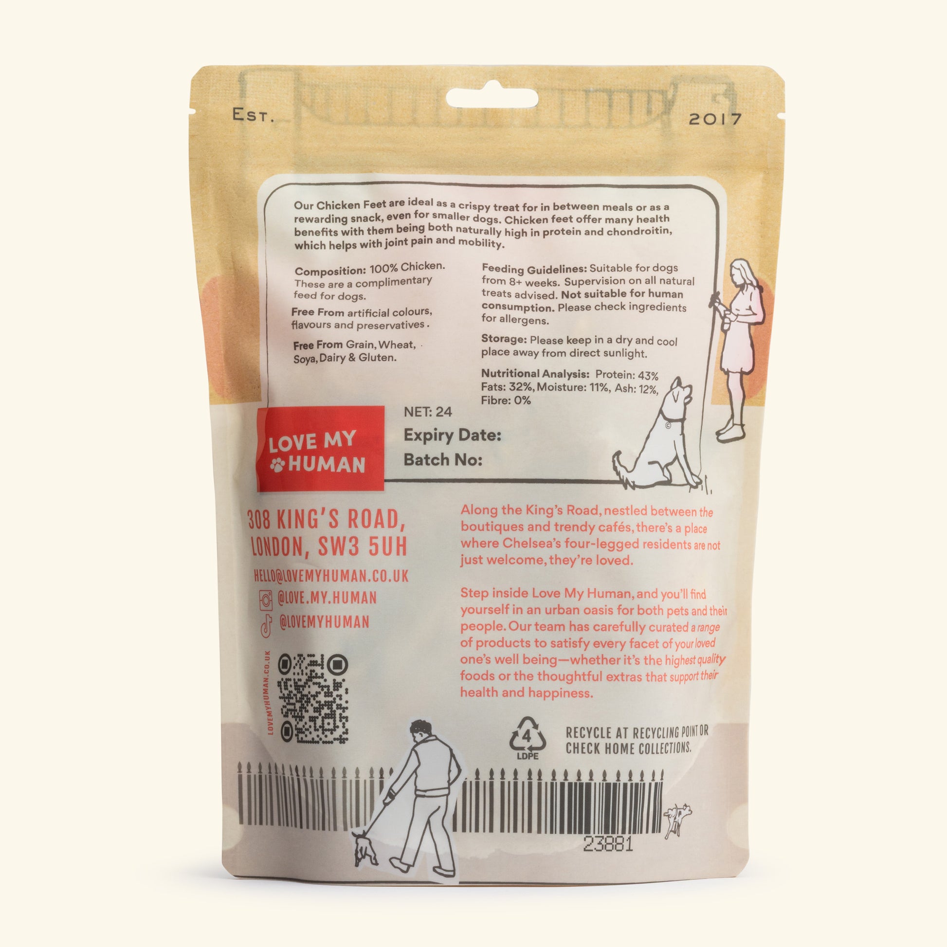 Composition: 100% chicken foot locally sourced from British farms. Free from artificial colours, flavours and preservatives. Grain, wheat, soya, dairy & gluten free.